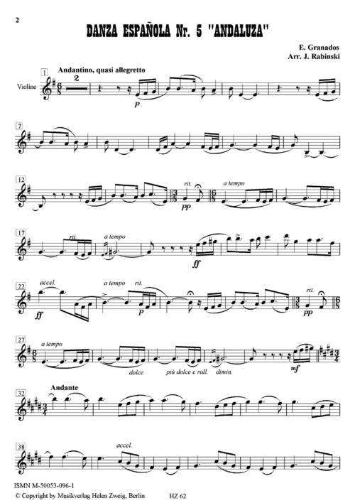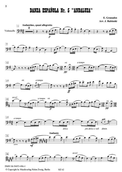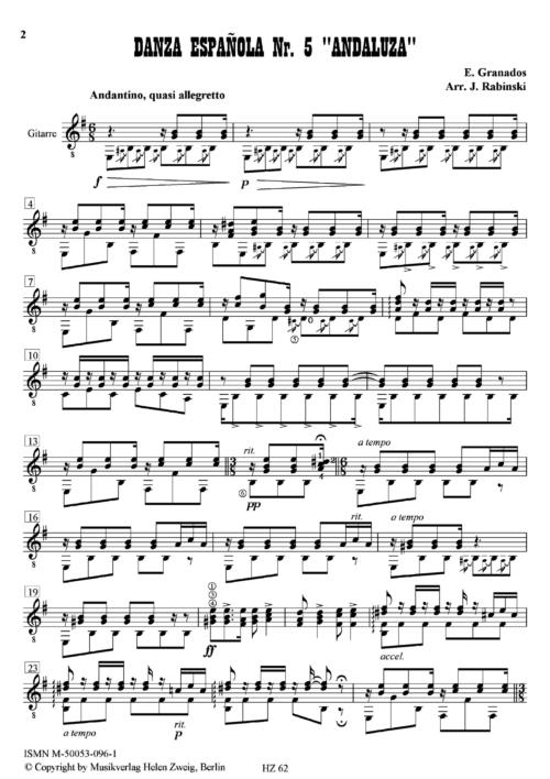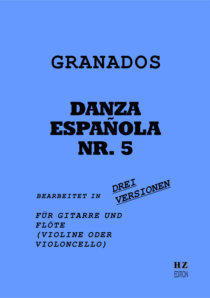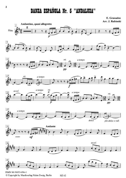 Enrique GranadosDanza Española Nr. 5 “Andaluza”Bearbeitet und herausgegebenvon Jacek RabinskiBearbeitet in drei Versionen:für Flöte (Violine oder Violoncellound Gitarre)Tonart: e-moll4 Seiten, Hochformat A4, geheftetAusgabe: StimmenAufführungsdauer: 5’Schwierigkeitsgrad: mittelschwerBestellnummer: HZ 62ISMN M-50053-096-1Preis: € 12,90