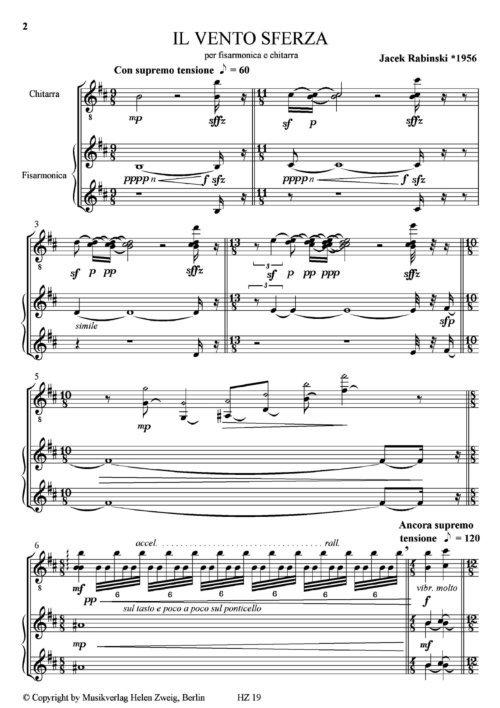 Jacek RabinskiIl vento sferza per fisarmonica e chitarraEntstehungsjahr: 1986Tonal und Atonal. Aleatorik.29 Seiten, Hochformat A4, geheftet.Partitur und Stimmen Aufführungsdauer: 12’Schwierigkeitsgrad: sehr schwerBestellnummer: HZ 19ISMN M-50053-021-3Preis: € 25,95