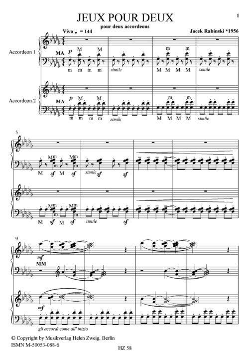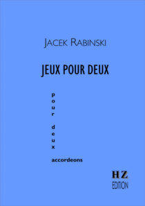 Jacek RabinskiJeux pour deux pour deux accordeonsEntstehungsjahr:1996Absolute Tonalität: reines Des-Dur27 Seiten, Hochformat A4, geheftetAusgabe: Partitur und StimmenAufführungsdauer: 5’30Schwierigkeitsgrad: mittelschwerBestellnummer: HZ 58ISMN M-50053-088-6Preis: € 24,00