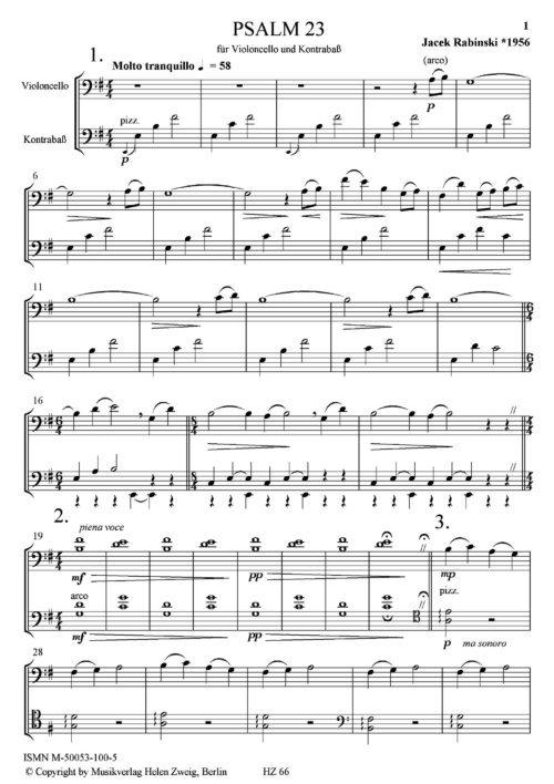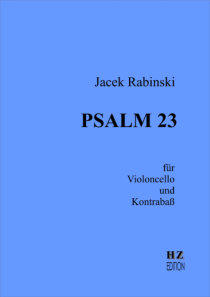 Jacek Rabinski Psalm 23 für Violoncello und Kontrabaß Entstehungsjahr: 1998 Absolute Tonalität: reines e-moll äolisch Psalm Davids No. 23 (nach der Übersetzung von Leopold Zuntz) 4 Seiten, Hochformat A4, geheftet Ausgabe: Spielpartitur und Stimmen Aufführungsdauer: 7’ Schwierigkeitsgrad: schwer Bestellnummer: HZ 66 ISMN M-50053-100-5 Preis: € 12,95
