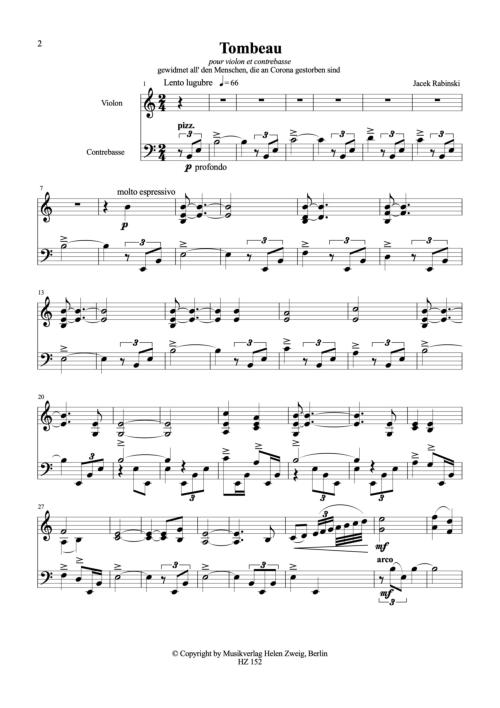 Jacek RabinskiTombeaupour violon et contrebasseEntstehungsjahr:2020In zwei Versionen für: Kontrabaß in Orchester- und SolostimmungAbsolute Tonalität: reines e-moll äolisch4 Seiten, Hochformat A4, geheftetAusgabe: SpielpartiturAufführungsdauer: ca. 5'30 Schwierigkeitsgrad: mittelBestellnummer: HZ 152M-50053-190-6Preis: € 9,95